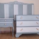 Cama vintage que data de alrededor de 50 o 60 años.Se ha recuperado de forma original con rayas en tonos verde azulado y blanco roto ,con pintura respeta el medio ambiente (bajo VOCS), con una técnica de decapado en las molduras. Hemos terminado dando una capa de cera natural.