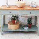 Este mueble de baño esta realizado de forma artesanal en madera de pino y pintado con técnica de decapado en color madera en el sobre y la estructura con acabado decapado en verde pastel sobre un tono de madera con pintura que eco-friendly (baja en VOC´s). Protegido con barniz para su uso.
