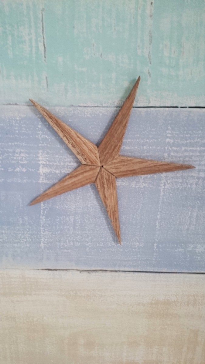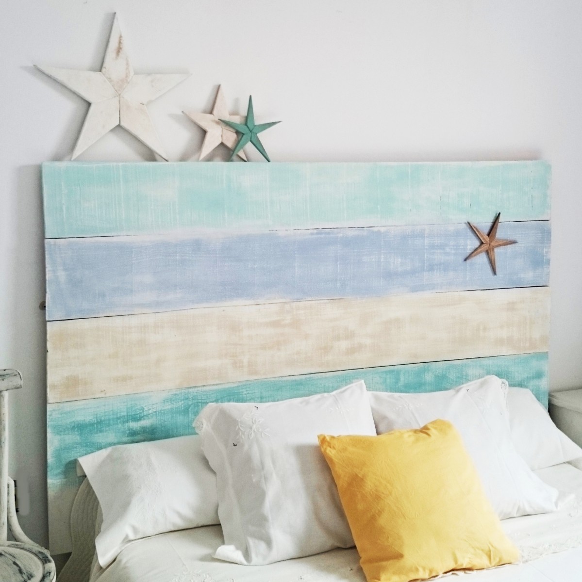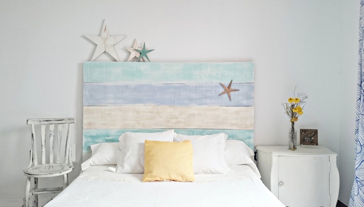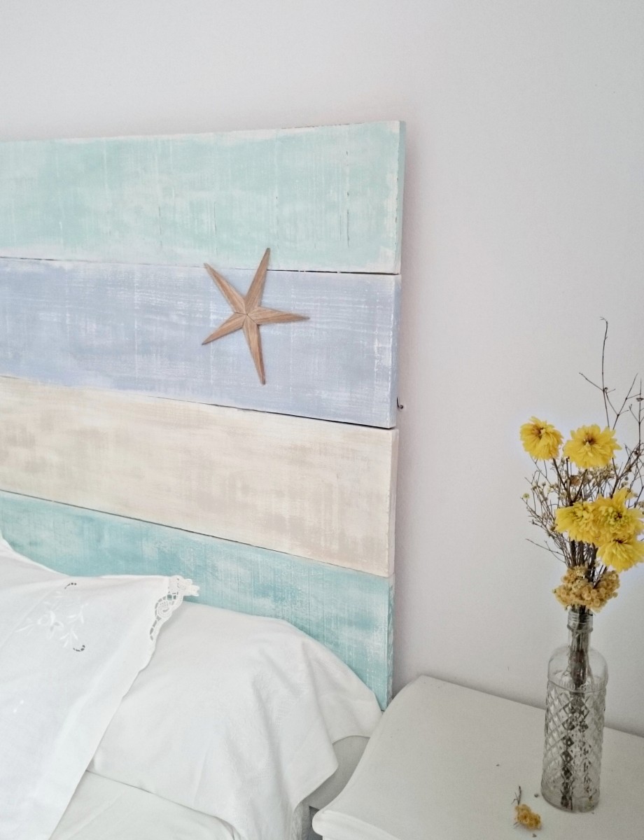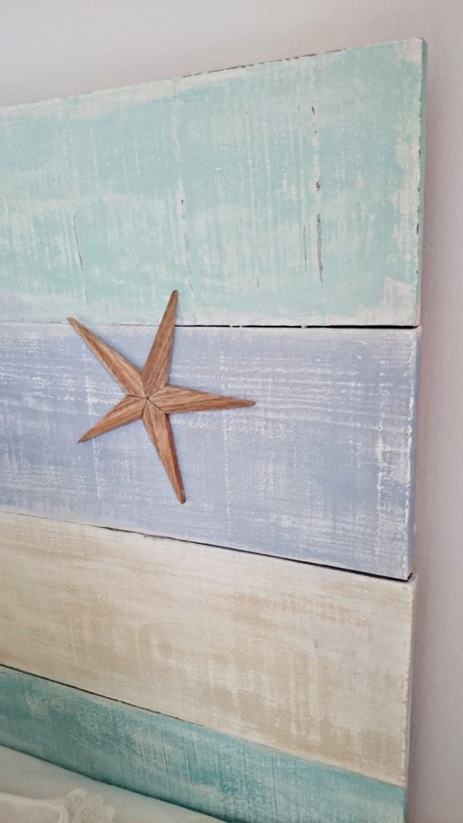 Cuando estaba terminándolo me ha recordado a los tonos de los mares caribeños de aguas verde azuladas y arenas finísimas asi que he pensado ¿y si le pongo una estrella? y dicho y hecho le he colocado una en el color natural de la madera para que contraste y juegue con los detalles de las otras que he puesto como motivo decorativo sobre el cabecero. Jugando con los blancos y turquesa.