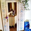 Precioso armario art decó recuperado con un estilo afrancesado estilo shabby chic con motivos en los laterales en tonos azules de pintura decorativa, trabajo realizado de forma artesanal,se ha respetado el espejo original en el que se puede apreciar el paso del tiempo confiriéndole un aire muy atractivo y evocador.