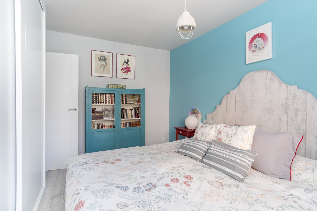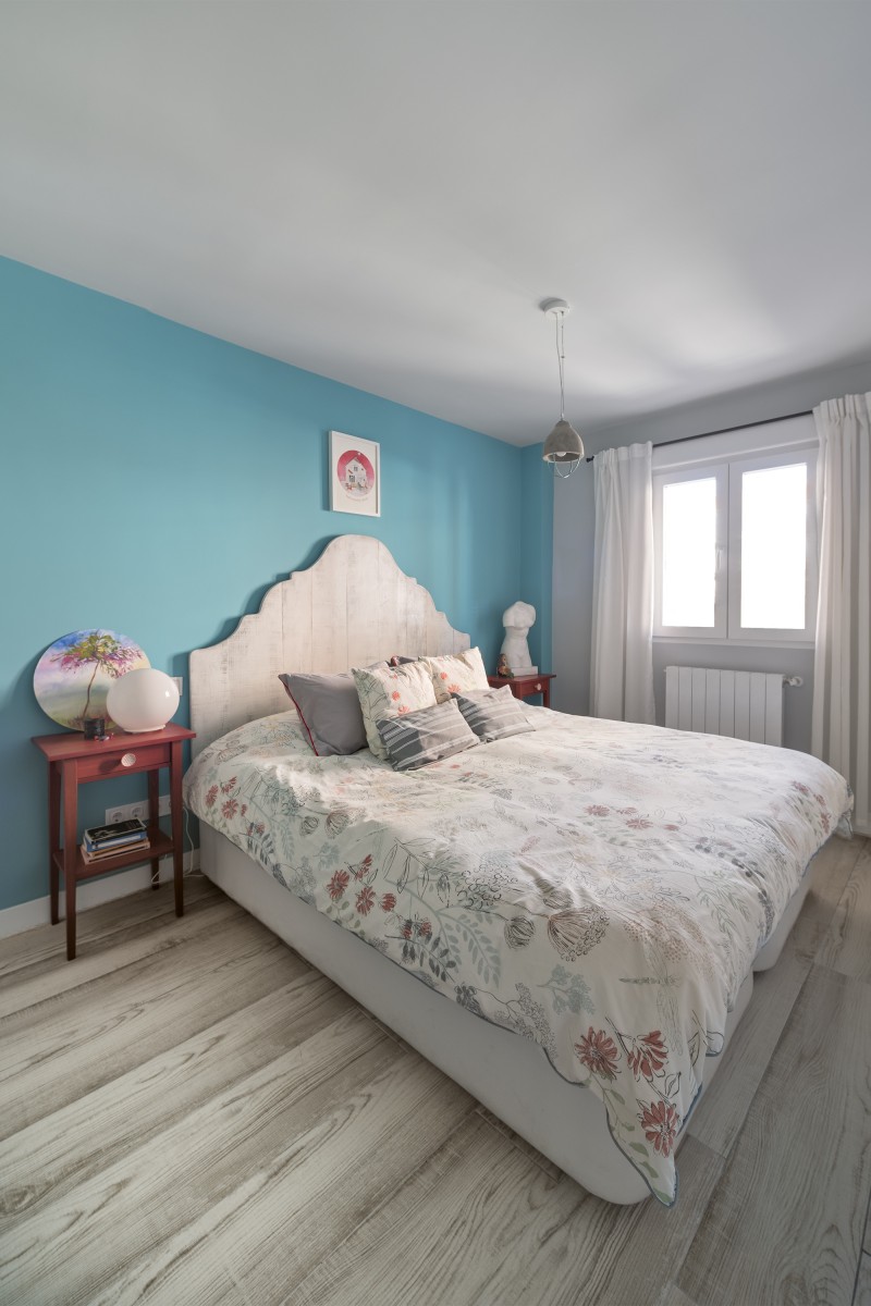 O como la que preside la cabecera de la cama en el dormitorio y donde luce requetebonito nuestro cabecero con ese fondo azul tan ideal que ha escogido.