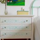 Cómoda en blanco con tres cajones decorados con detalles en tono verde menta. De líneas rectas y estilo boho chic.