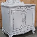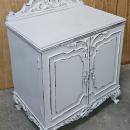 Gran mesita vintage en blanco decapado de dos puertas y cajón interior. Ha sido recuperada dándole una aire shabby (desgastado) en tono blanco roto con pintura que respeta el medio ambiente y con acabado en cera natural. El interior se ha pintado en un tono turquesa.
