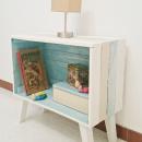 Mesita de noche realizada en nuestro taller hecha de forma artesanal, en madera de pino macizo,La hemos pintado con pintura de base al agua "eco-friendly" (baja en VOCs) en tonos suaves con el interior en color turquesa y acabado patinado con cera blanca..