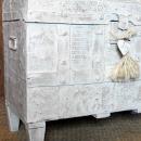 Baúl antiguo decapado en blanco que hemos renovado en este caco con dos manos de pintura la segunda en blanco antiguo ,después de secado se decapo para que se viese la capa primera.Hemos conseguido que se realce la parte antigua metálica del baúl produciendo un estético efecto.En su interior hemos incorporado un bonito papel de calidad.Seguidamente le hemos puesto en todo el perímetro interior un cordón vegetal pegado.